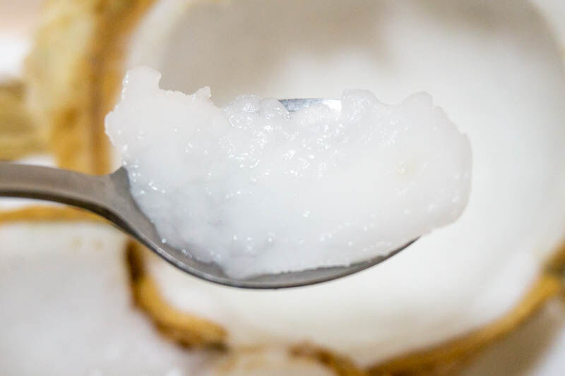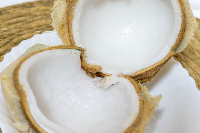 ココナッツウォーターを飲んだあとは、割って実の部分を食べます。