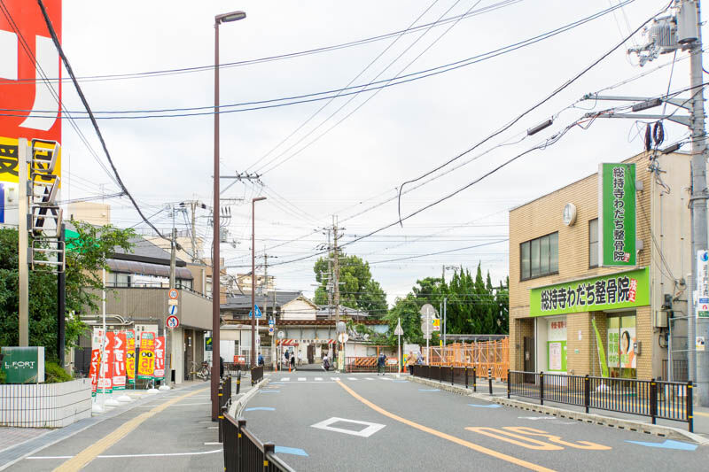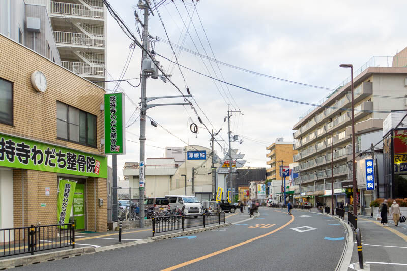 反対方向に行くと、FRESCOや大阪行岡医療大学などがあり、JR総持寺駅方面。