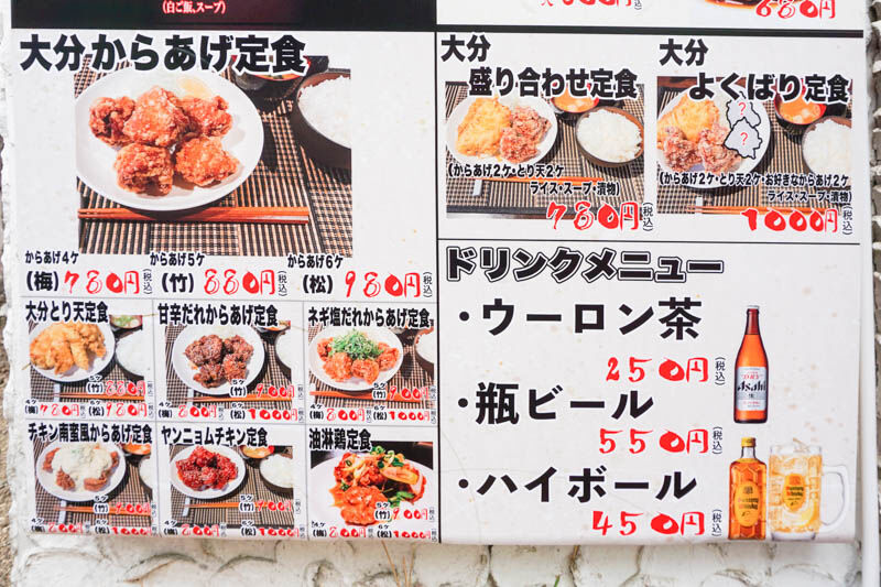 から揚げ専門店ですが、唐揚げやお弁当のテイクアウトの他、店内にて定食などを食べたりすることも可能です。