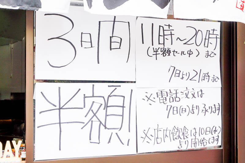 チラシには22時までと記載がありましたが、お店の外の貼紙は7日から21時までと書いていたので、行くときは事前に確認してみてくださいね。