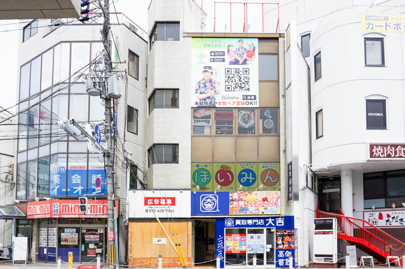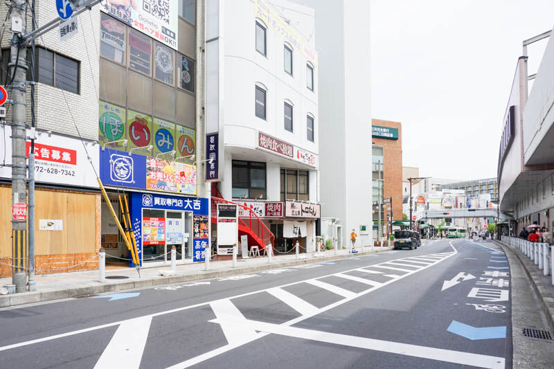 反対方向に行くと、同じビルの隣は買取専門店「大吉」があり、進んでいくと阪急高槻市駅北口バス乗り場や大阪医科薬科大学病院などの方面です。