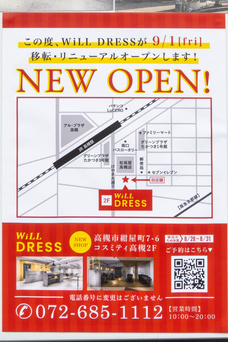 高槻本通りの「WiLL DRESS」が近くに移転するみたい。9月1日