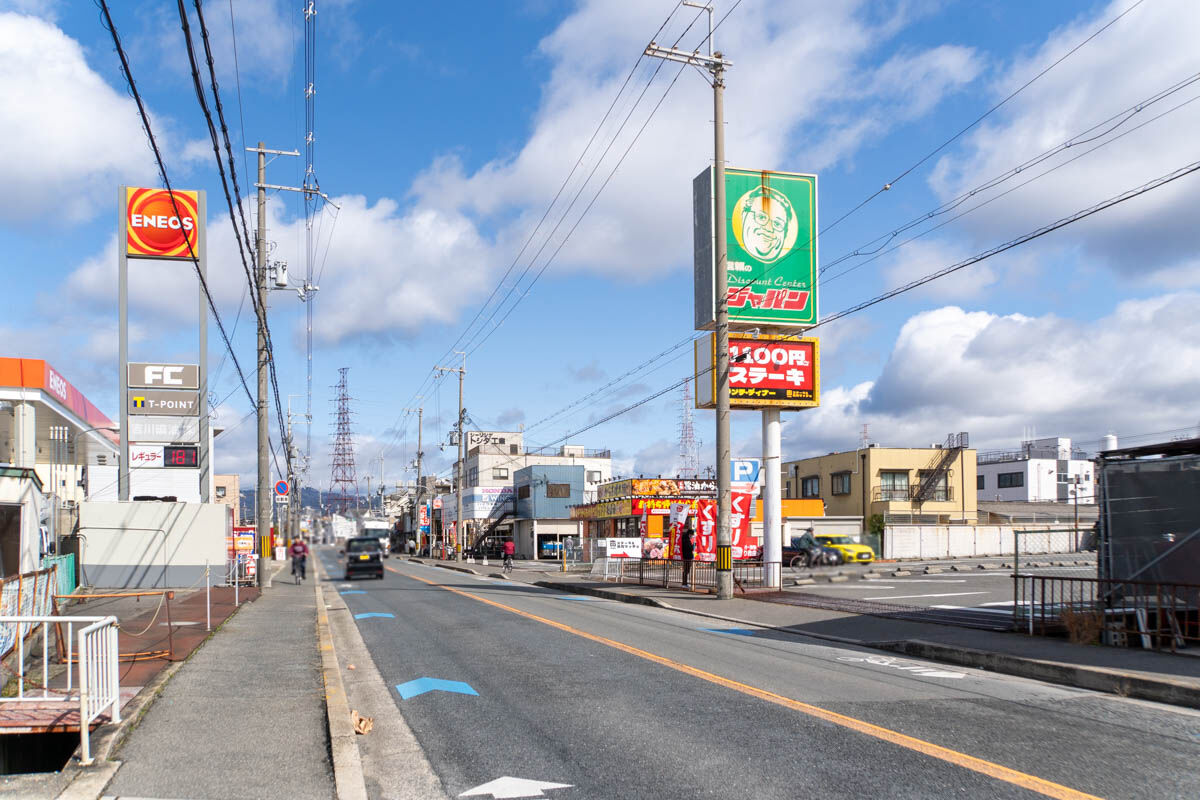 反対方向に行くと、総合体育館やコーナンなどがあり、府道14号線へ。