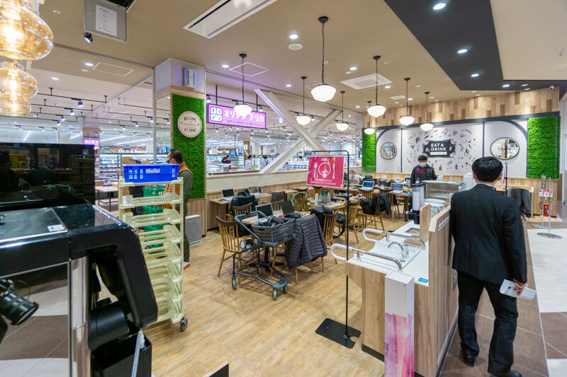 このイオンタウン茨木太田の核テナントとなるスーパーマーケットで、レジのお会計はすべてセルフなんだそう(セミセルフ含む)。