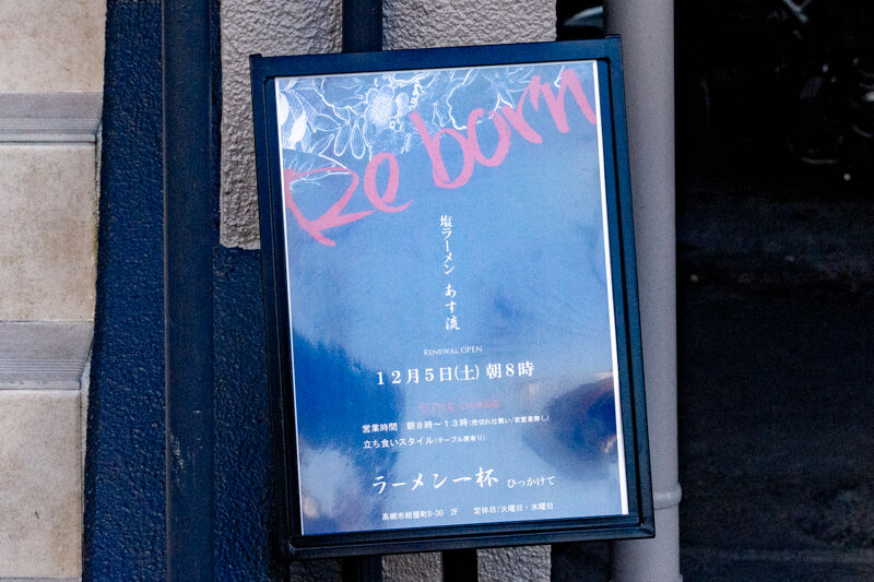 JR高槻駅ちかくのラーメン店「あす流」が3年ぶりに再開してる。朝ラーメンの立ち食いスタイル。行列がすごい