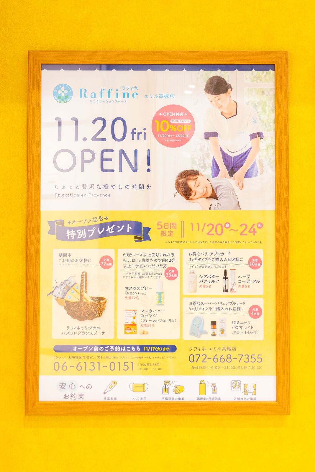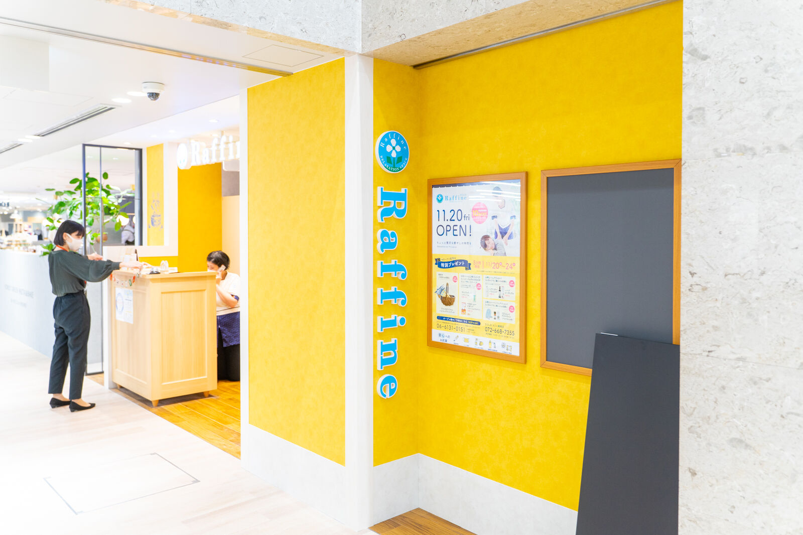 黄色い壁に水色の文字が印象的なRaffineはリラクゼーションのお店。(→公式サイト)