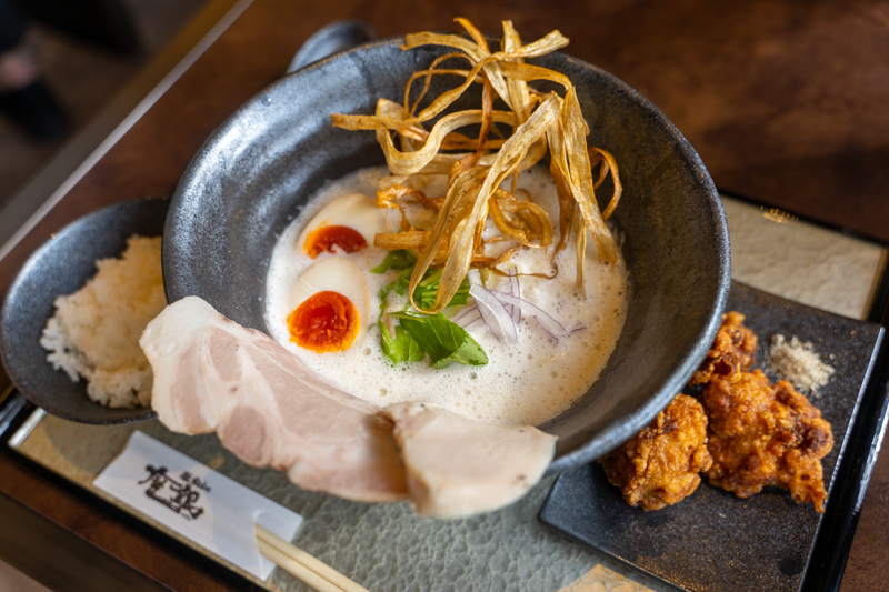 「鶏soba座銀」はトッピングのゴボウがすごい、鶏白湯ラーメン推しのお店。肉寿司の取り扱いもあります。(→公式サイト)