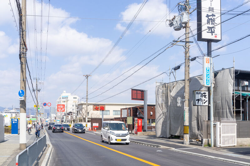 写っていませんが、向かいには東洋メビウス高槻物流センターなどがあり、進んでいくとユニクロやTSUTAYAなどの前を通って市役所の方へ。