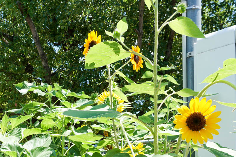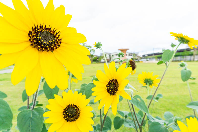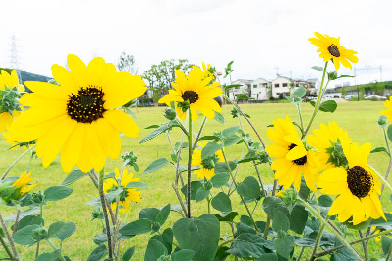 大人の身長より高いくらいの、背高めだけど、やや小ぶりな可愛らしいひまわりが咲いています。