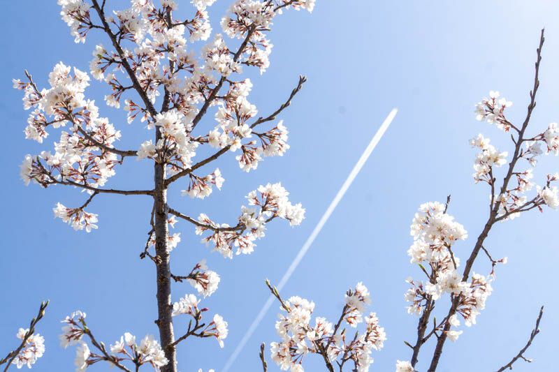 真夏日みたいな日で、一気に桜も開花。早咲きの桜は満開で、全体的にみると数日で満開なのかな〜という感じ。ちょうど晴天の空に飛行機雲がきれいに映えていました。