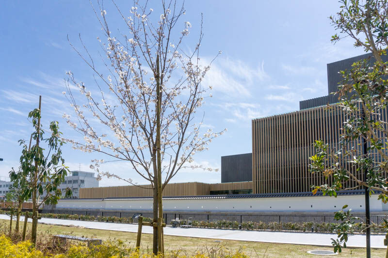 3月18日にオープンしたばかりの高槻城公園芸術文化劇場にも、ところどころに桜の木が植えられていまして、八分咲きぐらいでした。