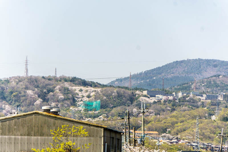 緑ネットの右に見える建物は関西大学です。山の方も桜の木の部分だけピンクに染まっていてきれいですね〜!