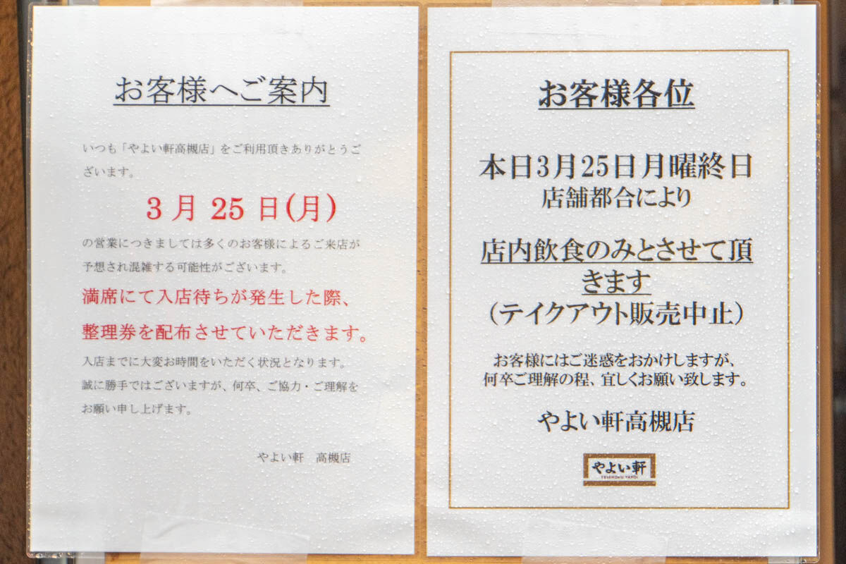お知らせによると、3月25日はテイクアウトの販売を中止し、店内飲食のみとする模様。