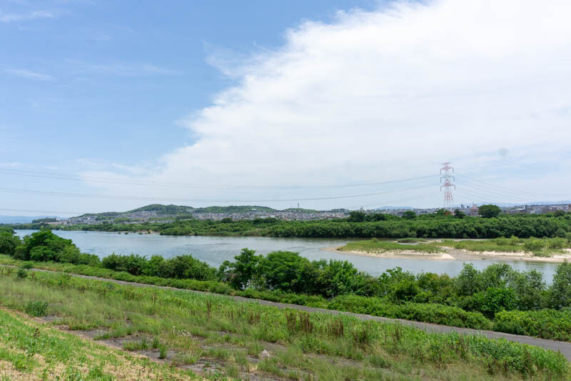 この写真手前の緑の部分と、淀川を挟んだ向こうにある「くずはゴルフリンクス」というゴルフ場の敷地手前の緑地部分までが高槻市の大字上牧のようです。対岸にもいくつかあります、高槻市。