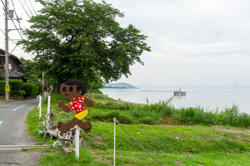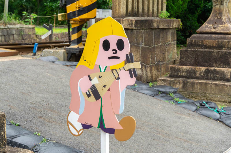大津市に入ると、飛び出し坊やも琵琶法師に!