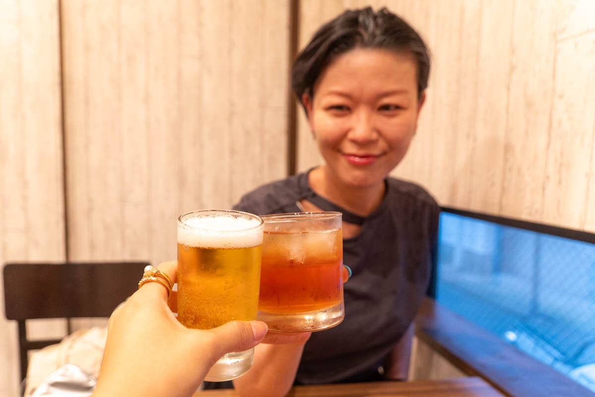 まにゃむは梅酒ロック、リナティはびんビールです。