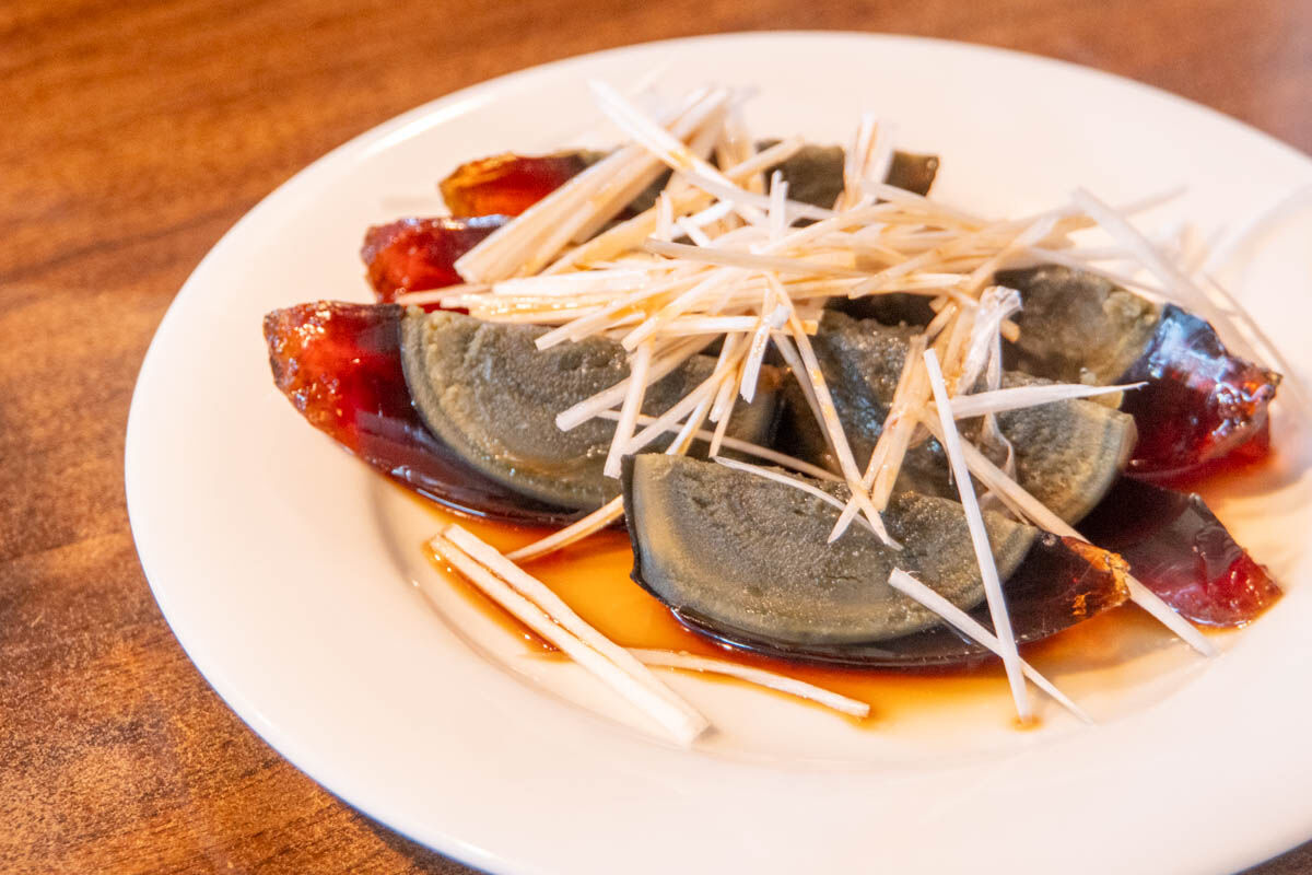 ちなみにピータンは発酵させることにより、白身の部分が真っ黒、中の黄身がグレーに色づいたとてもインパクトのある見た目に仕上がるんだそうです。