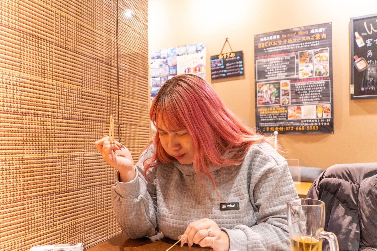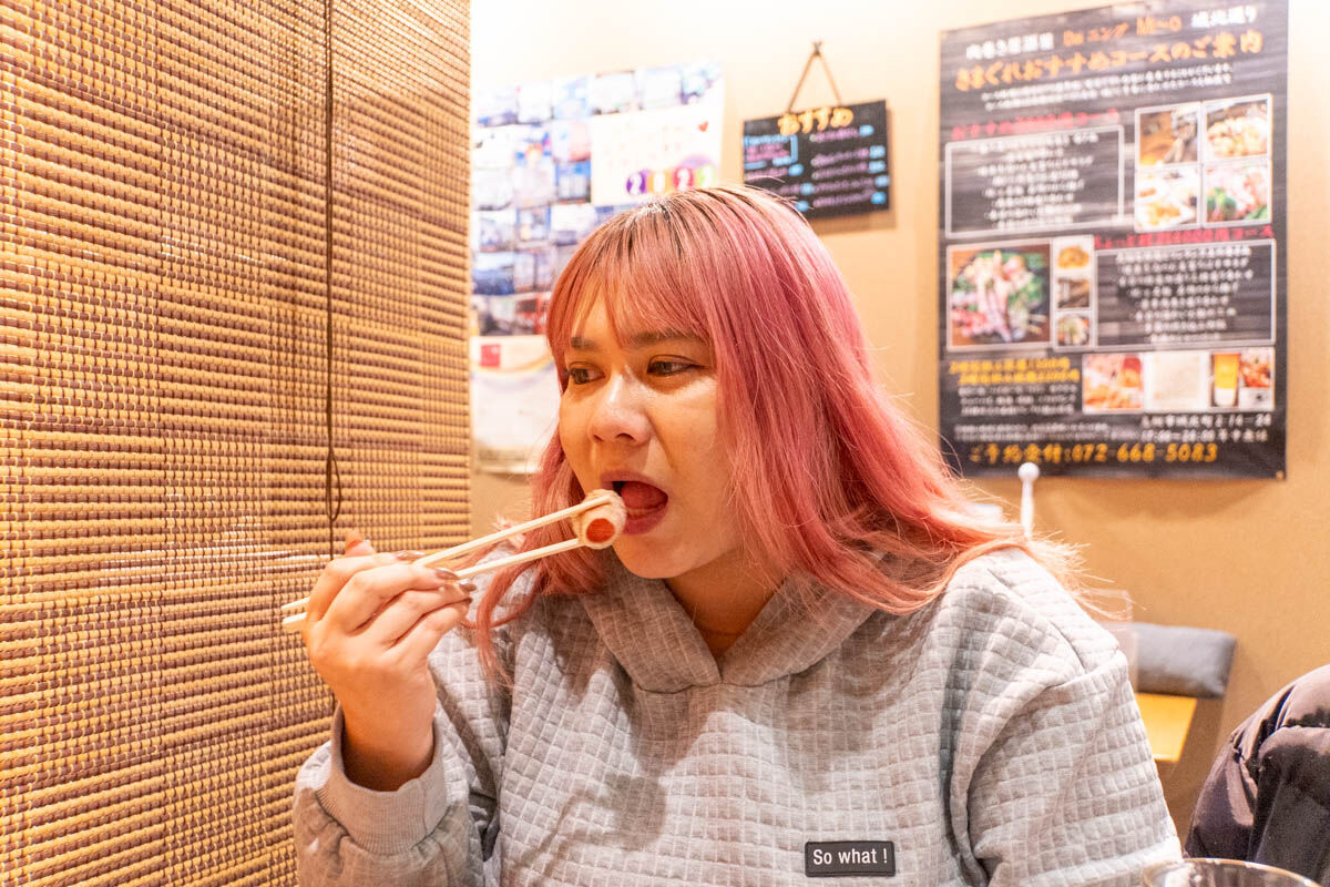 「じゃ、私はしそから!あ〜たしかに!塩加減が抜群ですね!さっぱりしてるけどお肉のジューシーさも良い!」