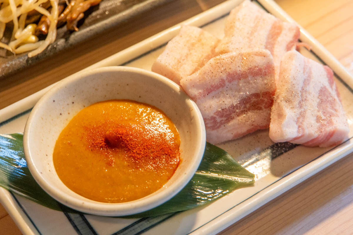 「豚バラは焼き上がったら、このにんにく味噌をつけて食べるらしいですよ!」