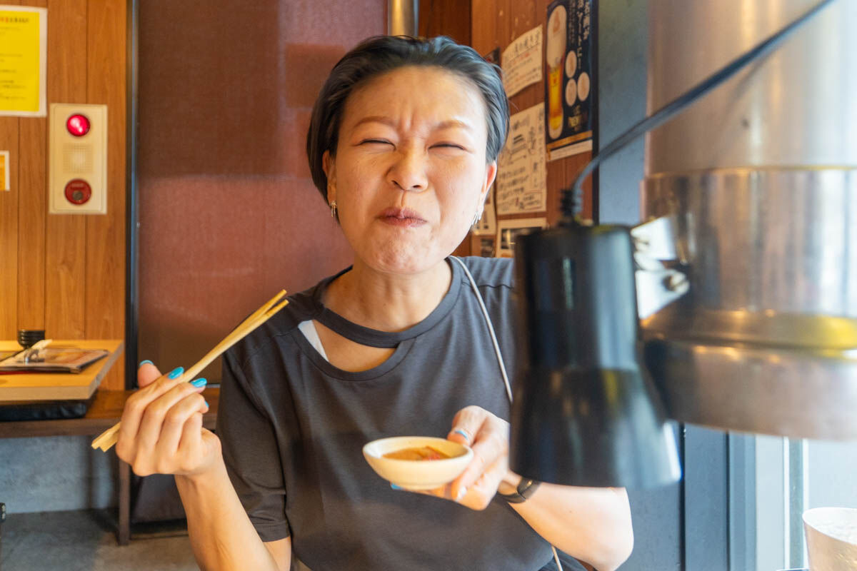 「え〜〜〜〜濃い味噌がお肉と合いすぎる〜!ジューシーな豚バラの脂身と調和してめっちゃ美味しい!」