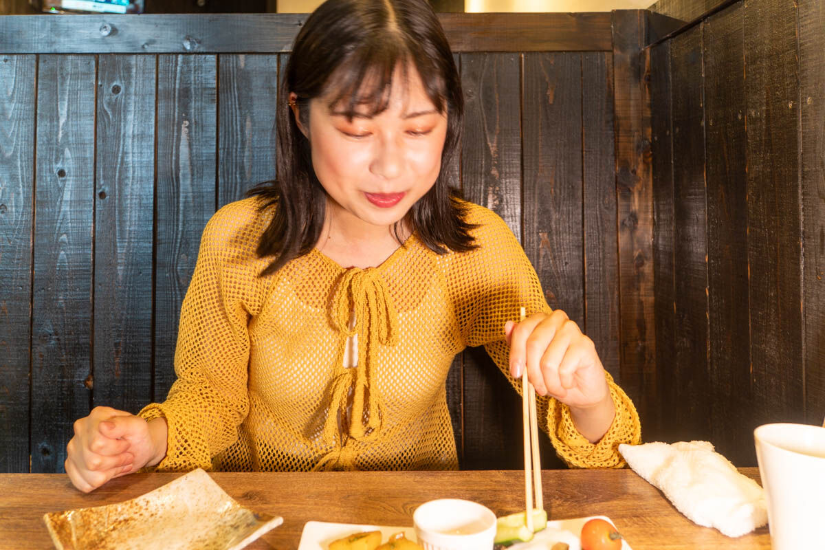 「付き出しに高槻の野菜が使われているって素敵ですよね!すっごいシャキシャキでフレッシュな食感。この豆腐ソースもあっさりしていて好きです〜!」