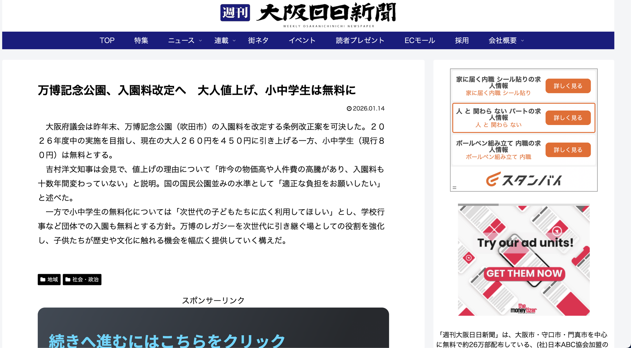 上記記事によると、大阪府議会が万博記念公園の入園料を改定する条例改正案を可決したとのこと。現在の大人260円を450円に、小中学生80円は無料なるようです。