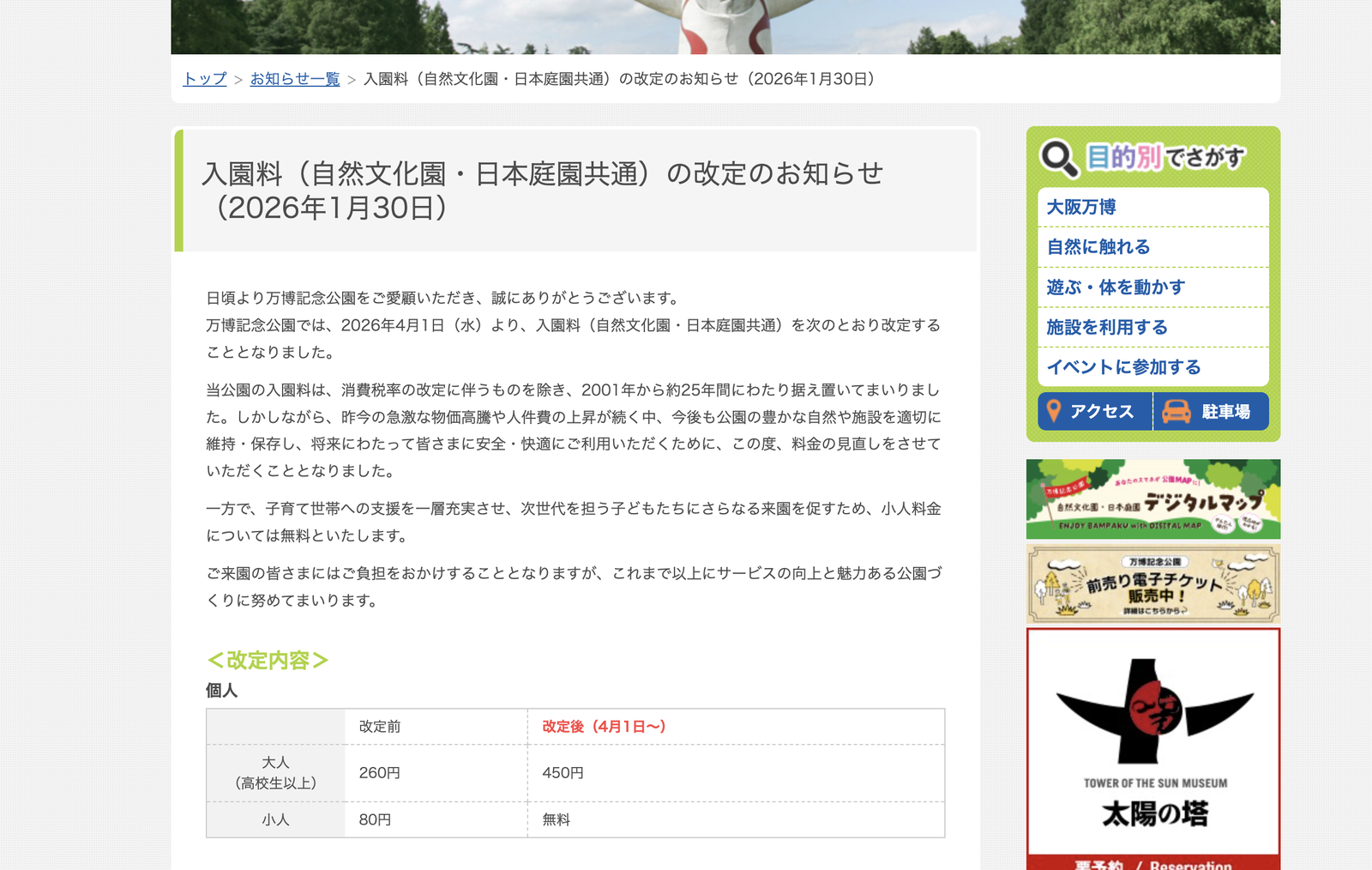 万博記念公園の公式サイトによると、料金の改定は4月1日〜とのこと。