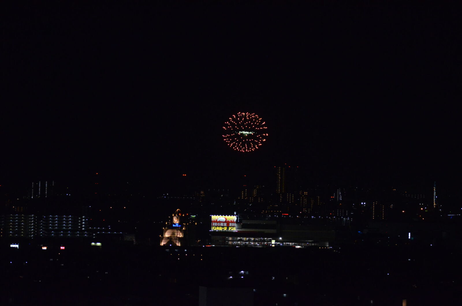 辻子あたりのドンキホーテとマリア・テレジアの上でばっちり輝く花火。