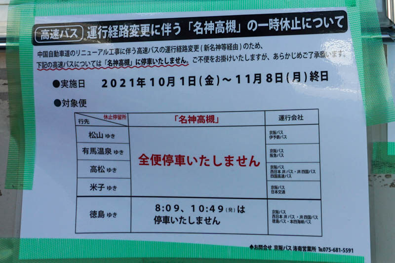 吹田JCTから中国池田IC(上下線)通行止めのため、2021年10月1日から2021年11月8日まで一部高速バスが「名神高槻」にとまらなくなる模様。