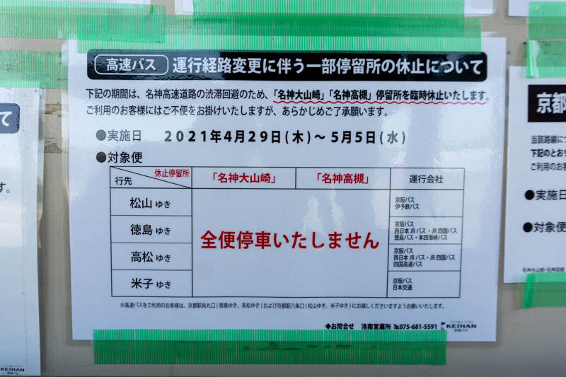 松山、徳島、高松、米子行きの京阪バスが名神高速道路の渋滞回避のため4月29日〜5月5日の間は運行経路変更を行うとのことで、名神大山崎と名神高槻のバス停が休止になるそうです。