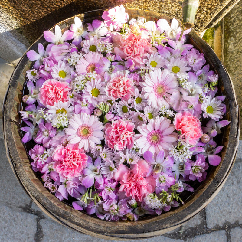 このように手水舎や手水鉢をお花で飾ることを「花手水(はなちょうず)」と言うんだそうです。素敵。
