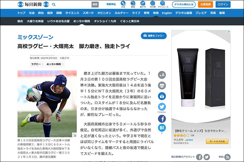 毎日新聞で記事になってるラグビー全国大会出場の東海大仰星・大畑亮太選手は高槻出身