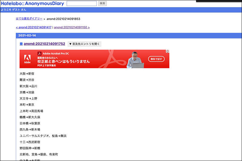 大阪→新宿 難波→渋谷 新大阪→品川 京橋→池袋 天王寺→上野 本町→東京 .. はてな匿名ダイアリー