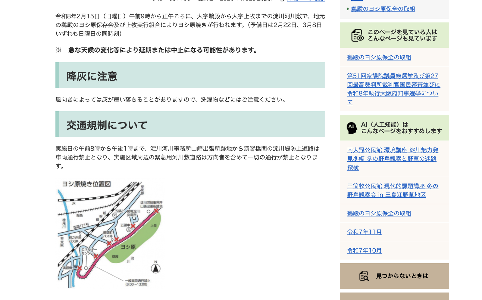 鵜殿〜上牧の淀川河川敷で「ヨシ原焼き」が行われるみたい。降灰と交通規制に注意。2月15日