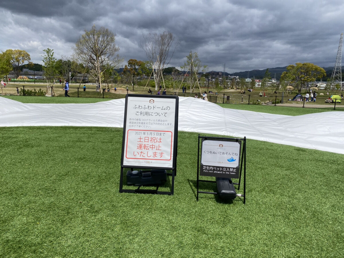 安満遺跡公園のふわふわドームが土日祝運転中止になってしわしわドームになってる。5月5日まで