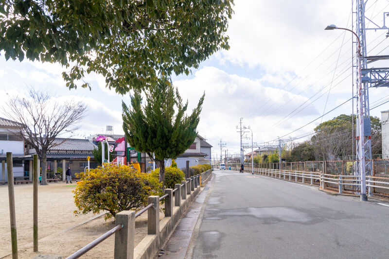 左側が線路で右側が公園。こっちに線路沿いに進んでいくと府道133号線を渡って阪急富田駅の方へ。