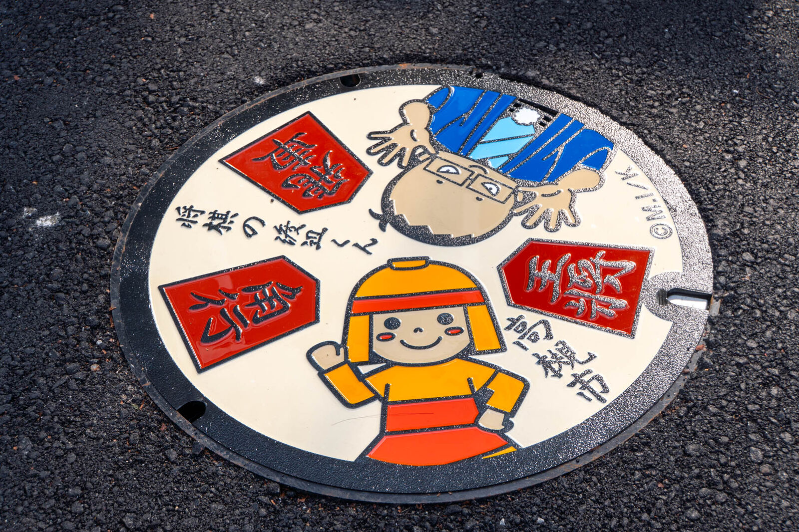 マンホールの絵柄は2種類。はにたんと「将棋の渡辺くん」のコラボ。