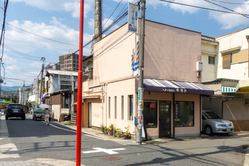 反対方向に進み、突き当りを右に行くと安満遺跡公園の方面。建物の予定地は「ヘアサロン キモト」をのぞいたL字型。
