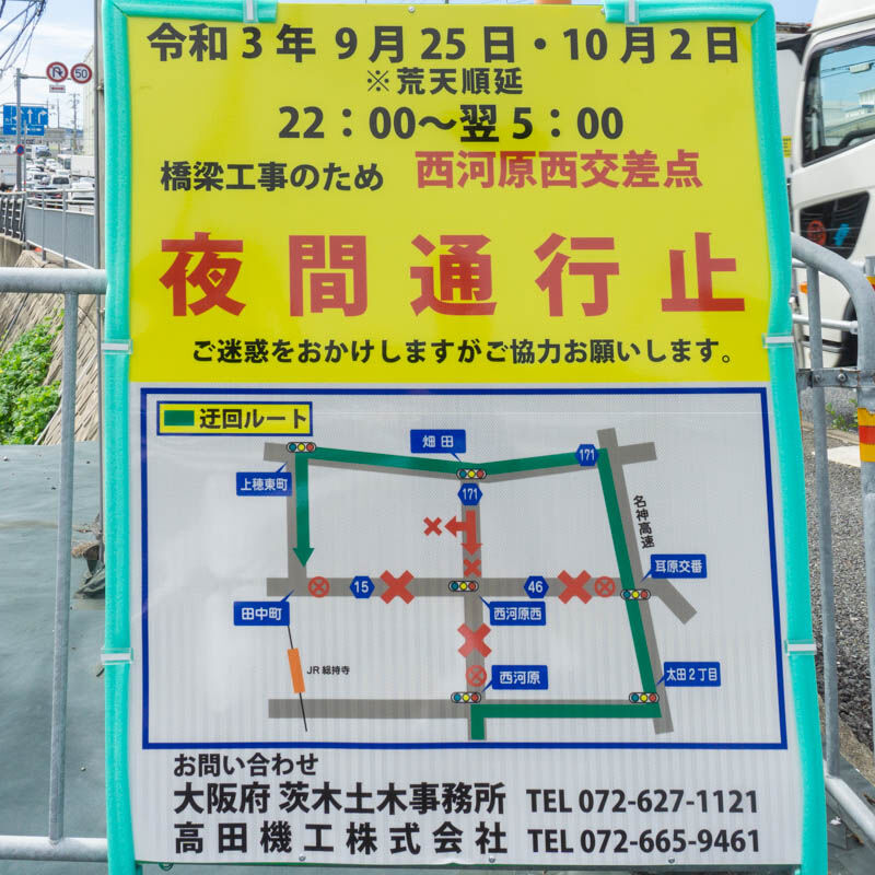 171号線の西河原西交差点が工事のため夜間通行止めになるみたい。9月25日と10月2日の22:00-翌5:00