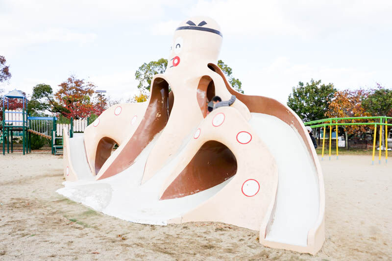 こちらにはタコさん型の滑り台があり、いつも大賑わいです。階段はないのと、滑り台自体が結構急なので自分で登れるくらいになるまでは付き添ってあげるといいかも。