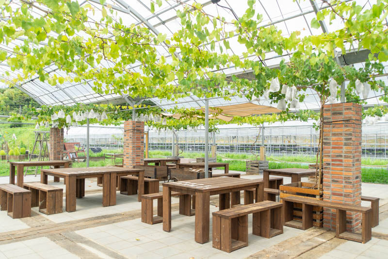 アーチに「grape farm」と書かれている通り、BBQエリアの屋根にはぶどうがぎっしり!