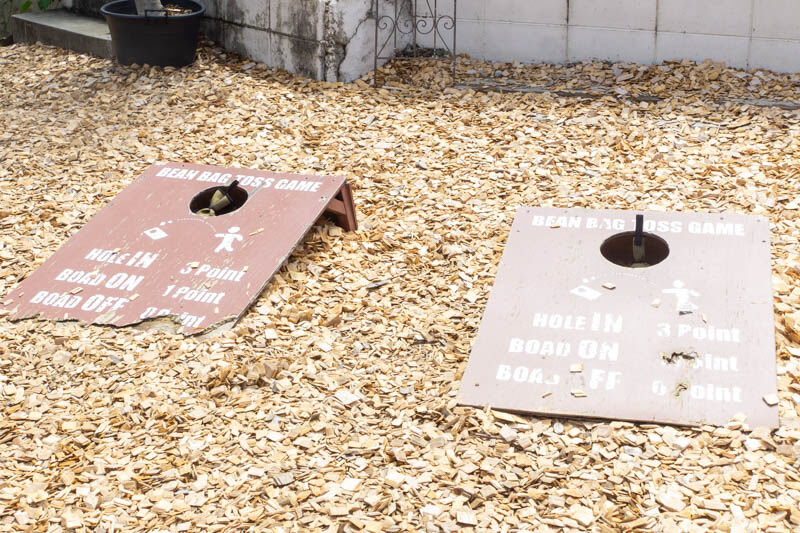 こちらは空洞めがけて豆のバッグを投げるゲーム!やってみると意外と難しい…!