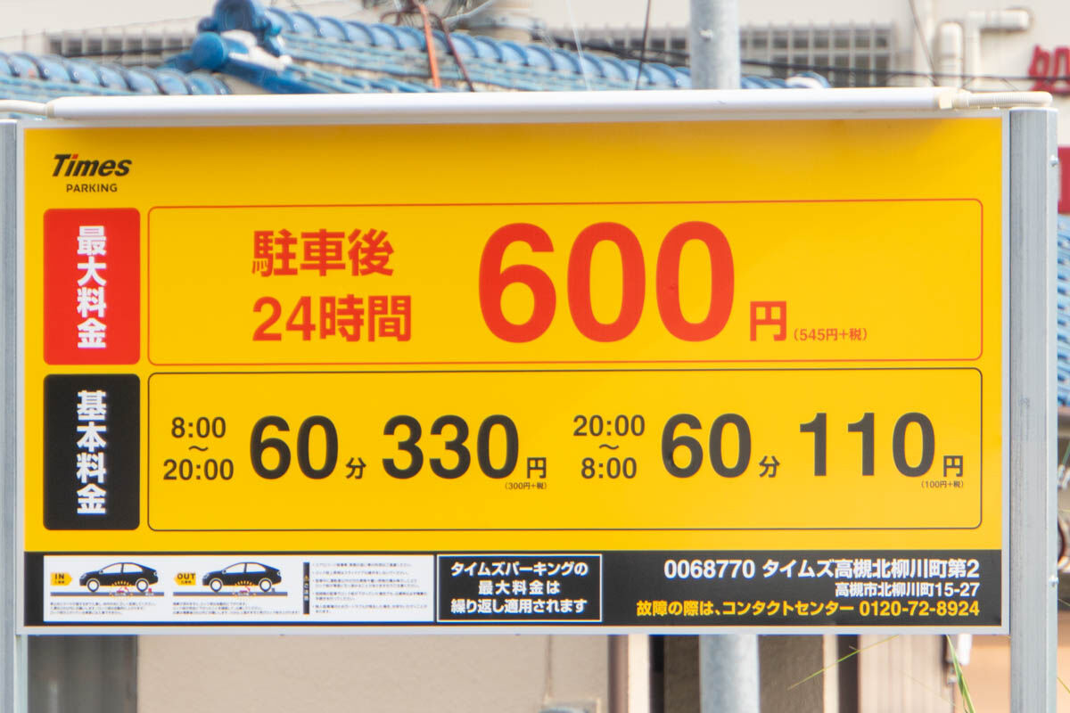 7月に発見した新しい看板では駐車後24時間最大料金が600円に。280円も安くなっています。