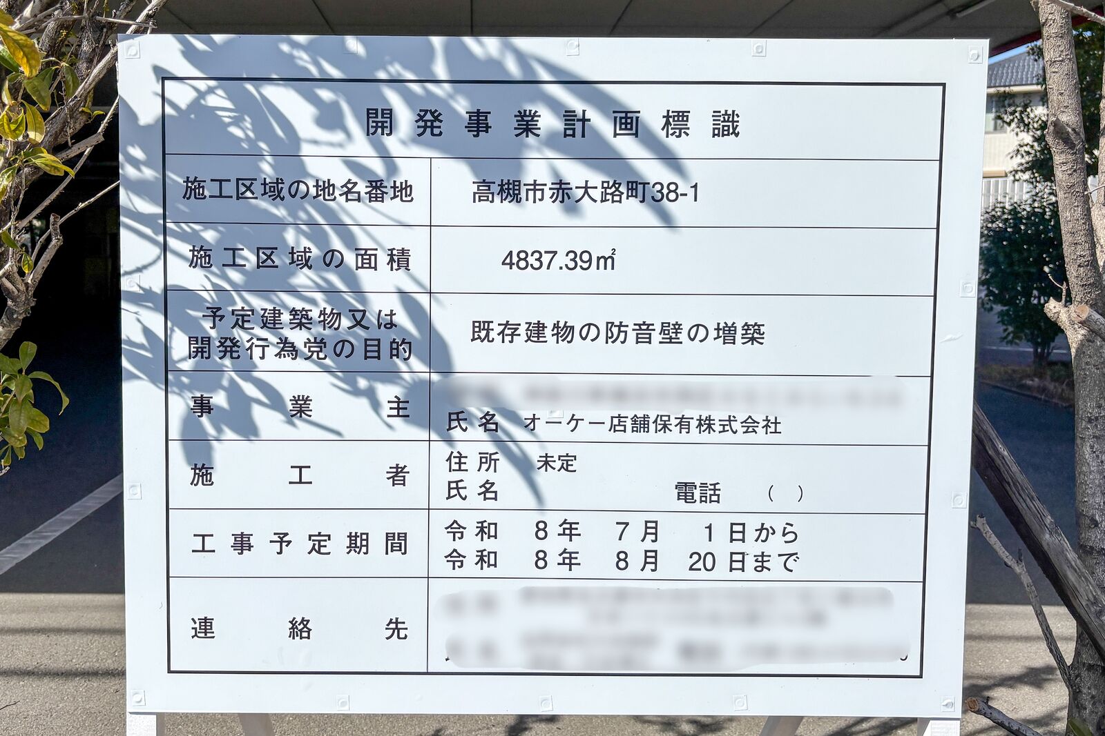 お知らせによると、「オーケー店舗保有株式会社」による既存建物の防音壁の増築工事が始まるとのこと。工事期間は7月1日〜8月20日まで。